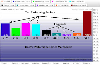 “Not All Sectors are Made Equal”. Typically at market bottoms the sectors that should lead on a relative basis are Financials, Consumer Discretionary, Technology, Industrials and Basic Materials. As you can see from the chart above those are exactly the areas that have exhibited the strongest relative strength during the current rally. The more defensive sectors such as Healthcare, Utilities, Energy, and Consumer Staples should be laggards. Again, this is the case.