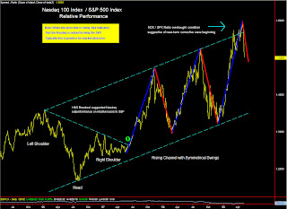 Classical chart analysis can be done as effectively on ratio charts as they do on traditional bar charts. You’ll first notice the the ratio chart (again…we are comparing NDX v SP500) that price carved a significant Inverse Head & Shoulders Pattern during 2006. This suggested that Nasdaq would take a more pro-growth leadership role and investors should begin to overweight technology stocks. The Blue waves indicate NAZ outperformance and Red waves underformance versus SP500. The waves are very symmetrical defining the rising channel pattern You’ll notice that when the ratio hit the upper channel line Nasdaq entered a period of underformance and subsequently the markets corrected.