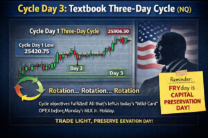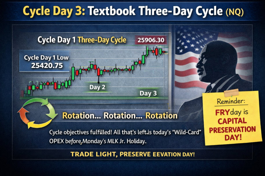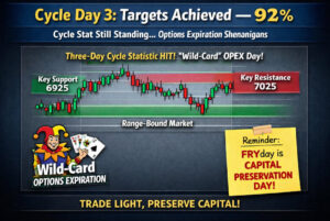 The Three-Day Cycle Statistic has officially done its job, which places today squarely in “Wild-Card” territory, courtesy of Options Expiration. Translation: price discovery takes a back seat, positioning games take the wheel.