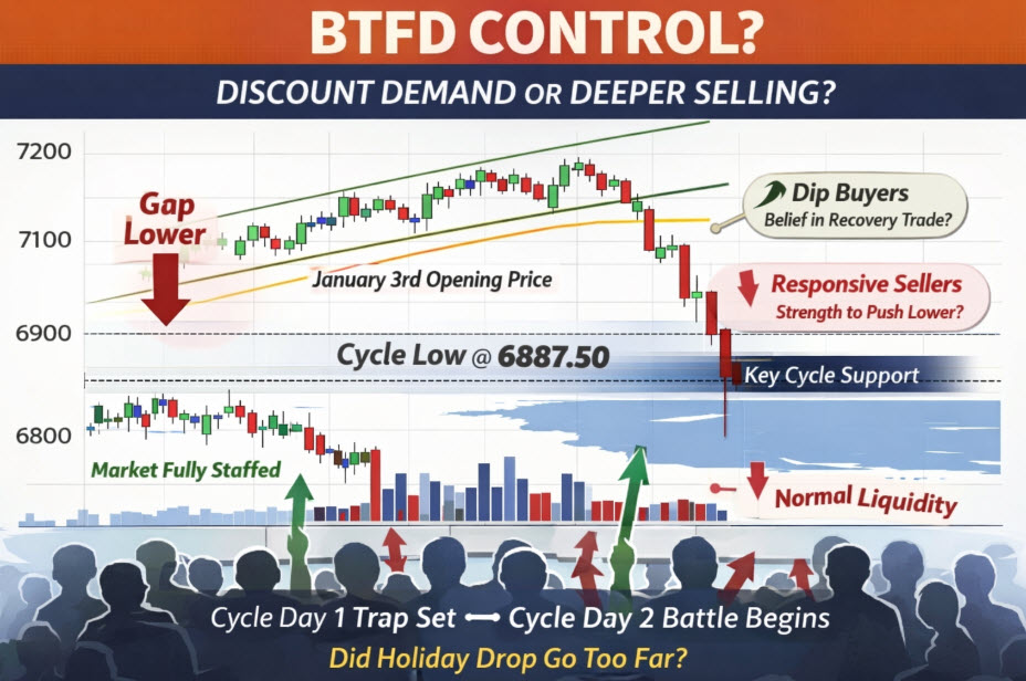 It’s also critical to remember the conditions under which that gap was formed. Thin holiday trade exaggerated the downside move, creating the illusion of urgency without full participation. Today, with trading desks fully staffed and normal liquidity restored, the real auction begins.