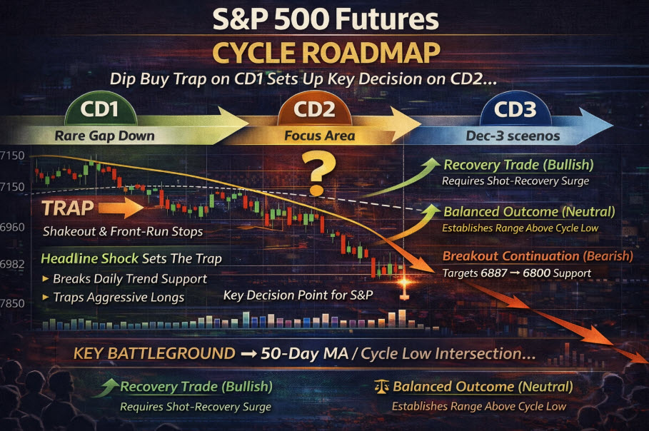 Importantly, the market has now established a Cycle Low at 6887.50, which becomes the primary key support level for evaluating this cycle’s performance. As long as that low holds, the broader cycle framework remains intact, despite the headline-induced turbulence.