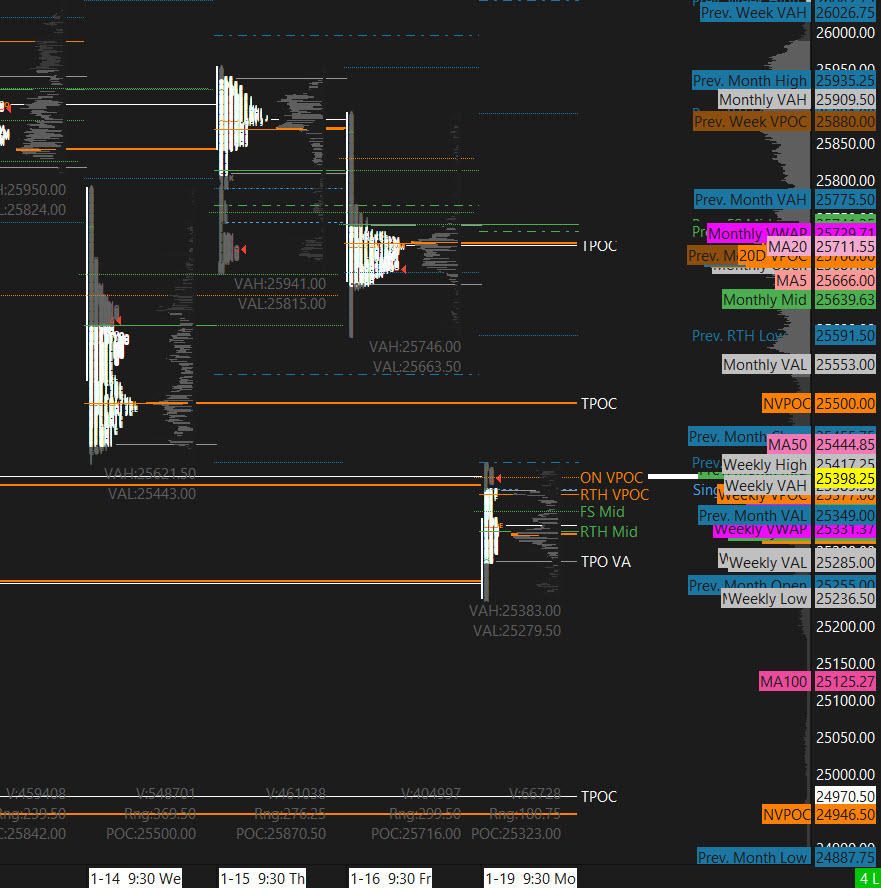 Adding to the pressure, the overnight liquidation was strong enough to push price below a key 50% pivot at 25,411.75. That level now serves as an important line in the sand. Sustained acceptance below it materially increases the odds that Cycle Day 2 evolves into continuation selling, rather than a simple recovery attempt.