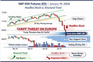 Sunday night trade opened with a clear case of headline-driven volatility as S&P 500 futures gapped lower following renewed tariff threats from the Trump administration tied to ongoing Greenland-related negotiations with several European nations. With U.S. cash equity markets closed for Martin Luther King Jr. Day, thin liquidity conditions amplified the initial downside reaction.