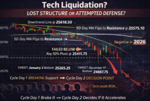 Today’s auction unfolded in a holiday-thinned environment where price discovery is notoriously unreliable. While the break of trend support introduces tactical technical damage, there has not yet been sufficient acceptance below key structural levels to confirm a broader trend transition. The 50-day moving average remains the immediate battleground between responsive buyers defending structure and sellers pressing the headline narrative.