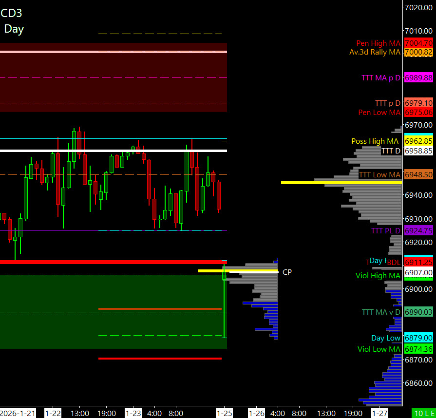 Primary goal for Cycle Day 3 is to trade above the CD1 Low (6911.25) to secure a positive 3 Day Cycle Statistic (92%).