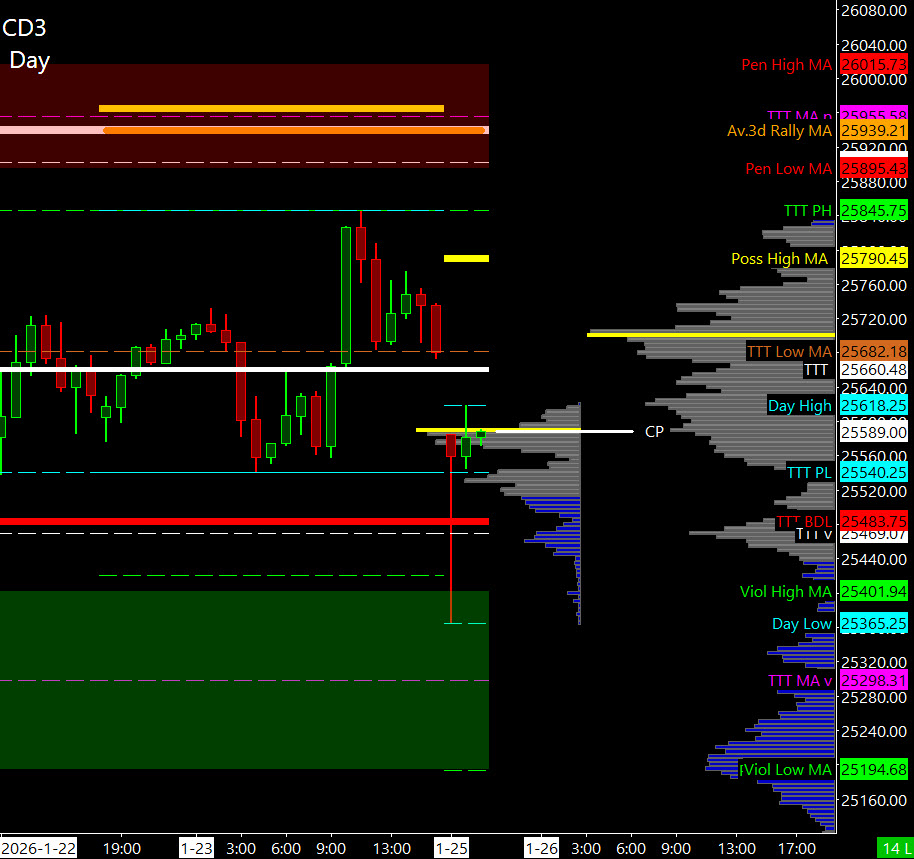 The GLOBEX gap down has reclaimed the Cycle Day 1 low at 25,483.75—now the line in the sand. This level must hold during regular trading hours to preserve bullish Cycle integrity.