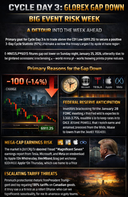 The E-mini S&P 500 (ES) futures gapped lower on Sunday night, January 25, 2026, primarily due to heightened uncertainty surrounding a “consequential” week featuring a Federal Reserve interest rate decision, a barrage of Mega-Cap earnings, and escalating trade tariff rhetoric