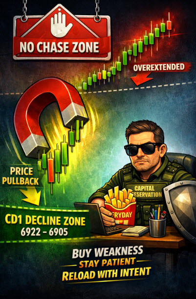 A normal CD1 expects some magnitude of decline to rebalance inventory and offer better prices. Thanks to yesterday’s liquidation break, the CD1 projected average decline zone (6922–6905) has already been tagged. Check the box. ✔️