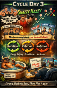 Transition into Cycle Day 3: Snazzy Nazzy continues to flex its bullish muscles like Hans & Franz — “We will pump you up!”