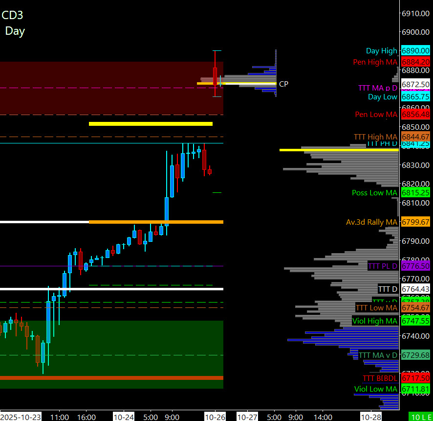 Transition into Cycle Day 3: Three-Day Cycle Target 6840 has been fulfilled, so with price above the CD1 Low (6717.50) the cycle statistic appears safely secured (91.67%).