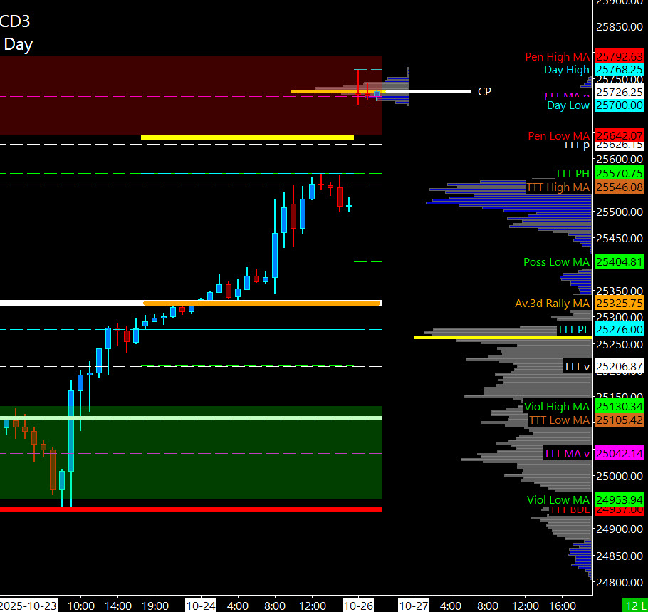 Transition into Cycle Day 3: Three-Day Cycle Target 25325.75 has been fulfilled, so with price above the CD1 Low (24937) the cycle statistic appears safely secured (91.67%).
