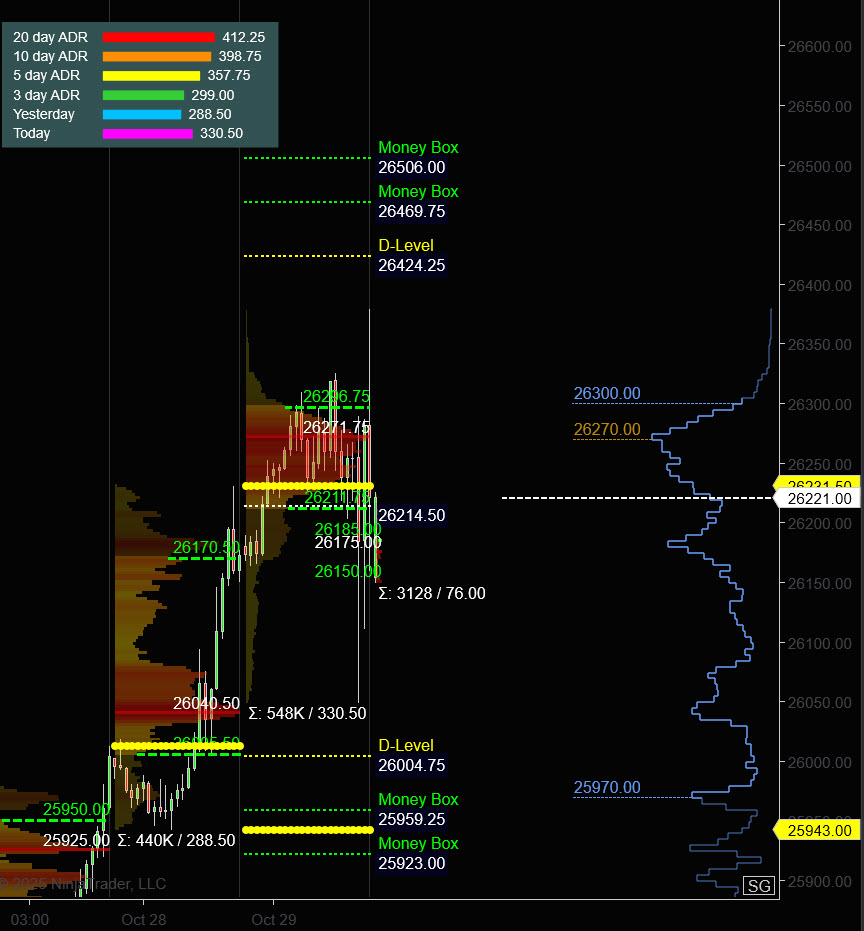 Prior Session was Cycle Day 2: Fed Day wide swings…New ATH…Tech Earnings were the main themes for the NAZ this session. The nimblest of traders caught the swings…Others just simply “got caught.” Upside D Level Money Box (DLMB) target zone was fulfilled. Range was 330 handles on 548k contracts exchanged.