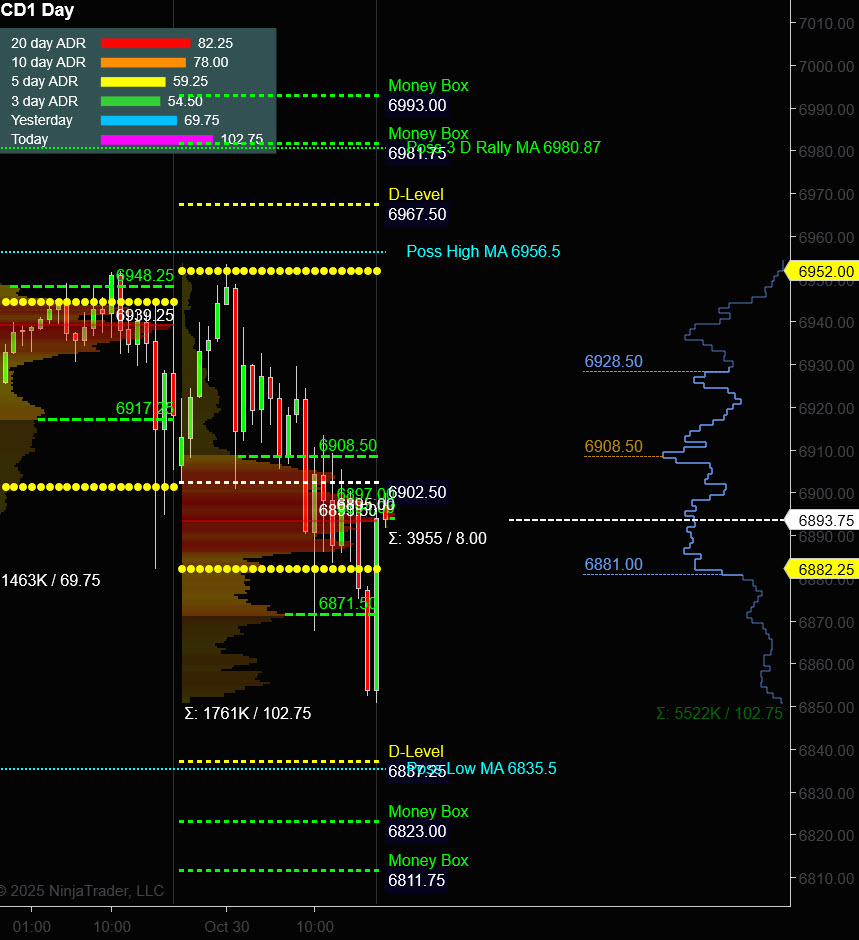 Coming off the Fed hangover, the market slipped into what David aptly dubbed a “distribution day” — that slow bleed where both sides think they’re right until VWAP starts mocking everyone. The early script had both upside and downside DTS targets hit, leaving traders with a “Post-Fed Blues” soundtrack and a 6915 line-in-the-sand dance floor.