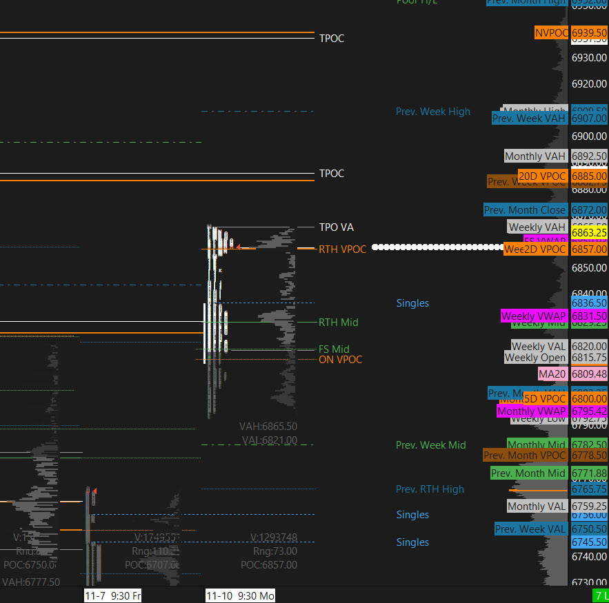 This session was a textbook Running of the Bulls — smooth, controlled, and unbothered by the occasional bear trap. From the overnight Continuation Long trigger @ ES 6780–6785, buyers accepted above and methodically marched toward successive targets: 6810 → 6815 → 6825 → 6830 — all achieved with mechanical precision.