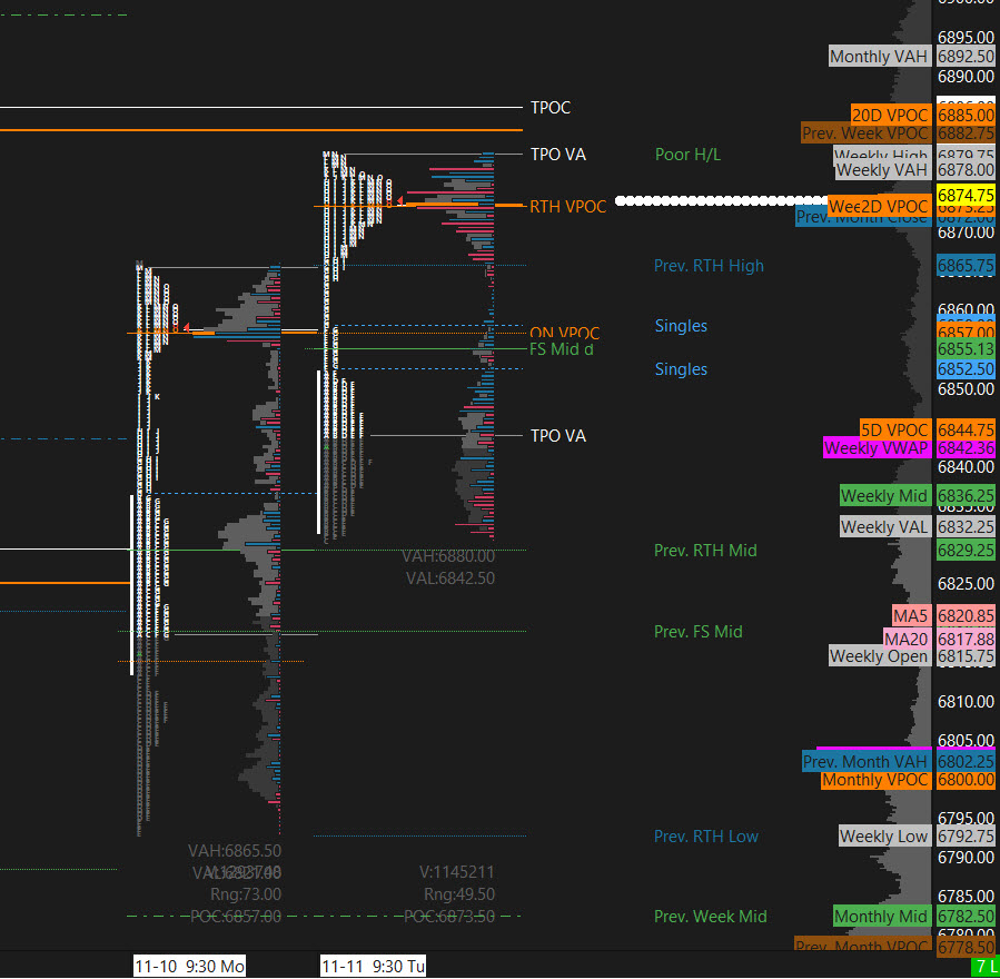 By mid-session, the Initial Balance (6831–6852) boxed the field. Price churned inside this “sandbox” while disciplined operators worked their playbooks — volume-weighted edges, delta confirmation, and tactical patience. Then came the moment of truth: a breakout reclaim of 6865.75 (prior high) lit the fuse on the bulls’ afternoon offensive.