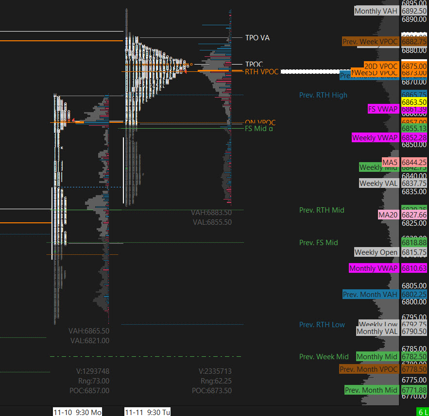 At the open, optimism gave way to the market’s favorite equalizer — liquidity. Price chopped between tactical zones as both factions launched early assaults. Bulls pressed their advantage above 6875, only to trigger the perfect bull trap — a swift counterstrike sent the ES tumbling into the 6855 bear target, fulfilling the DTS Bear Scenario to the tick.