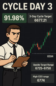 Transition into Cycle Day 3: We march into CD3 with the Three-Day Cycle Stat (91.98%) looming overhead like a stern hall monitor armed with a clipboard and zero sense of humor. The rule was simple: stay above the CD1 Low at 6594 during RTH or get written up.