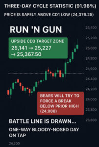 Transition into Cycle Day 3: – The Three-Day Cycle Statistic (91.98%) remains alive and kicking as price stays well above the CD1 Low at 24,376.25 during RTH.