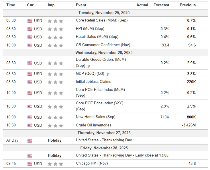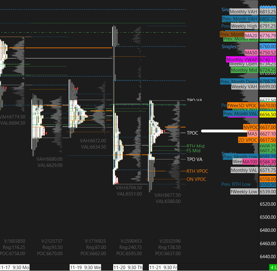 Sunday’s Globex opener pushed things a touch higher into the 6666 zone — numerology traders are already high-fiving — but still neatly tucked inside Friday’s range. With a short week ahead and Thanksgiving on deck, traders have at least one day to be grateful for all the chaos, volatility, and gifts the market bestows… whether we asked for them or not.