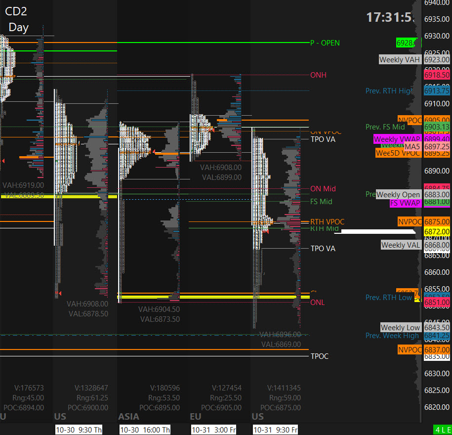 As the morning progressed, price action rotated around the 6885–6890 zone — a true battleground for liquidity.