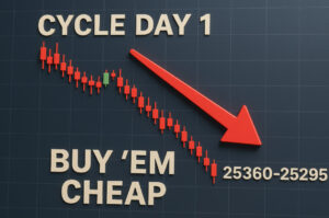 Today sets up beautifully for a textbook Cycle Day 1 pullback — the kind of orderly decline that makes Mutual Funds grin like they just spotted a half-priced Black Friday special.