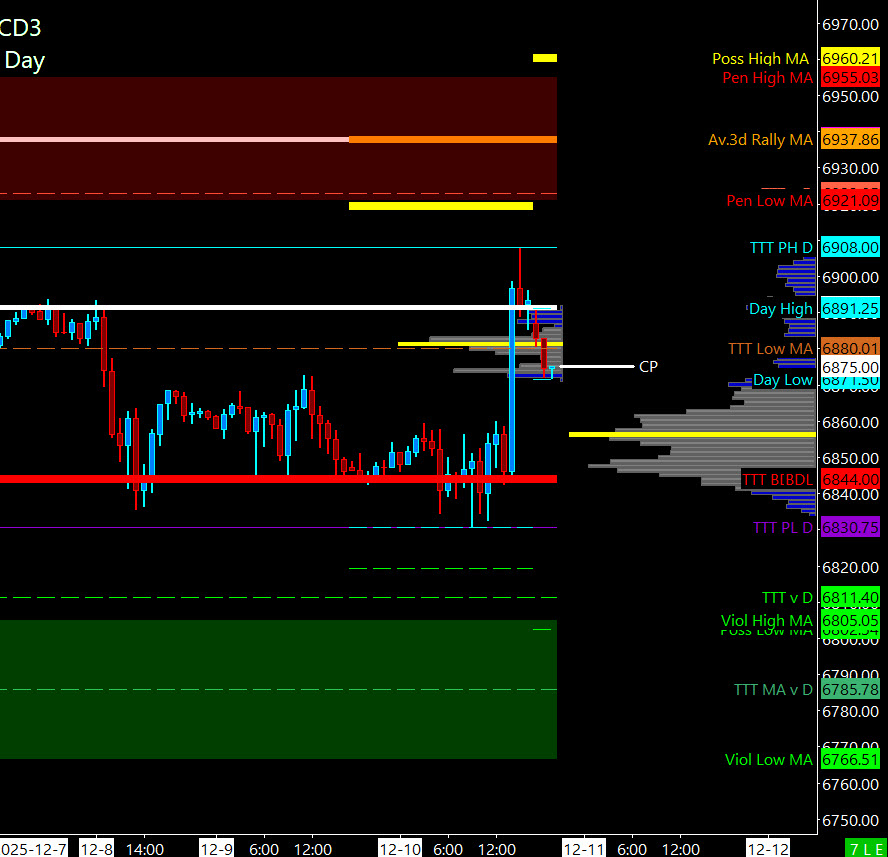 Primary 3-Day Cycle Target 6891 has been cleanly tagged—courtesy of JPOW’s holiday-season gift basket: a tidy 25 bps cut and a presser smoother than eggnog. With that, the Fed elves have clocked out for their Christmas party, leaving the market alone to face the cold, unforgiving world… no more pixie-dust magic to float price higher.