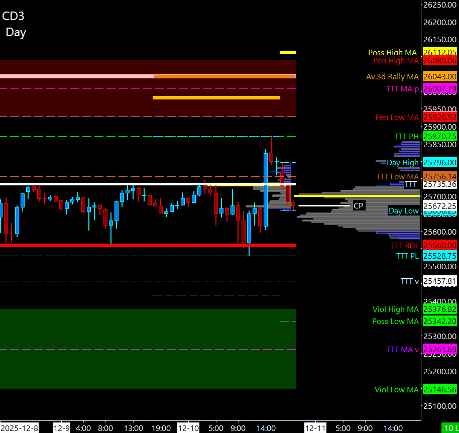 Prior Session was Cycle Day 2: This Cycle Day delivered exactly what the DTS Briefing telegraphed — a clean sweep of both the lower and upper target zones. The market even tagged the 25855 upper penetration target with surgical precision, as if the algos were following the PTG playbook line-by-line. (We won’t tell anyone.)