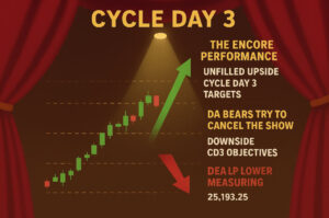 Prior Session was Cycle Day 2, and the NAZ strutted across the stage like it was auditioning for the lead in the next Broadway blockbuster. With perfect choreography, buyers punched cleanly above the CD1 high and marched price straight into the 1.618 Fibo Extension of the prior session’s range — the Golden Ratio, the market’s version of “hit your mark, darling.”