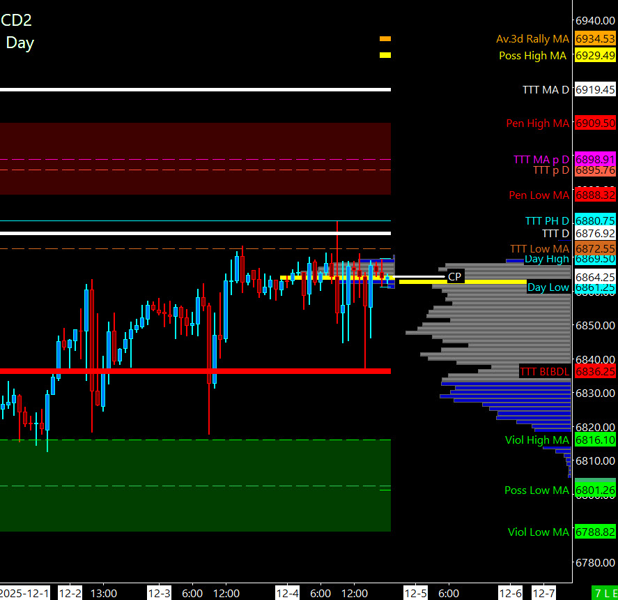 Price tagged the Cycle Day 1 Low at 6836.25 with surgical finesse — the kind of clean, exact touch that makes a neurosurgeon mutter, “Damn, even I don’t get margins that tight.”