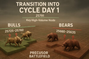 The prior session’s sell-down wasn’t exactly a plot twist — DTS Briefing 12.8.25 telegraphed the move with all the subtlety of a neon sign. The Chicago Bears’ lower target at 6835 hit with surgical precision, tagging the level that now becomes the Cycle Day 1 proving ground.