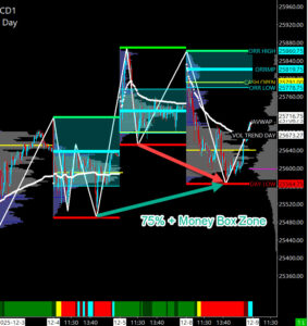 The session low at 25565 didn’t just “happen”—it quietly nailed the 75% Last Chance Retracement (LCR) and kissed the lower Money Box Target Zone like it was following a script only the pros were handed.