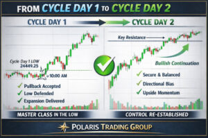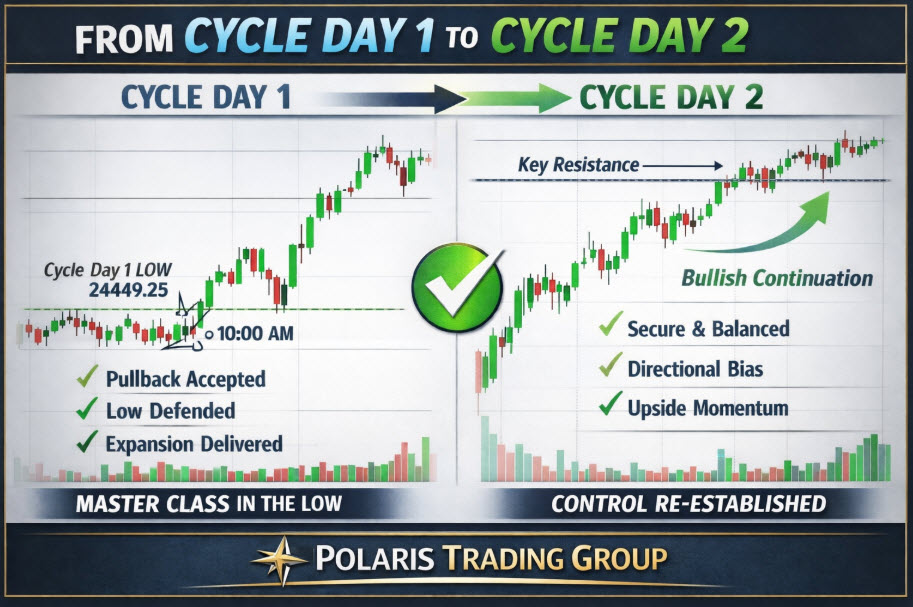 Cycle Day 2 isn’t about chasing strength — it’s about managing risk, respecting levels, and letting price prove itself. -