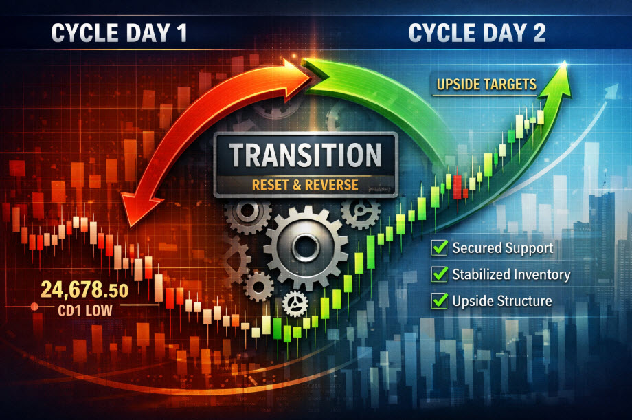 Cycle Day 2 isn’t about chasing strength — it’s about managing risk, respecting levels, and letting price prove itself. -