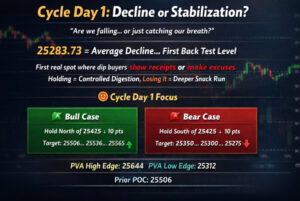 Cycle Day 1 downside projections have already been fulfilled and exceeded during the prior session’s liquidation. The late-day bounce merely squared some intraday exposure—it did nothing to alter the broader dynamic.