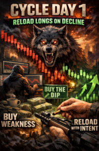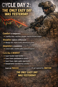 What worked on Cycle Day 1 won’t work automatically today. Context shifts. Volatility changes character. Patience becomes a weapon.