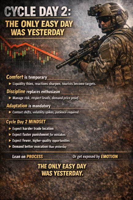 Cycle Day 2 isn’t about chasing strength — it’s about managing risk, respecting levels, and letting price prove itself.