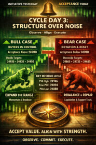 Cycle Day 2 spent much of the session digesting gains and building structural balance, a classic sign that the market already completed the majority of the cycle’s directional work. The market climbed the mountain… now it’s deciding whether to camp, consolidate, or scout the next ridge.