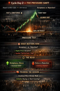 Price has already retraced 50% of that impulse, placing today squarely in true Cycle Day 2 fashion — the Pressure Test.
