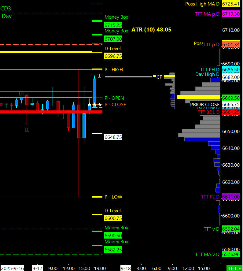 Increased volatility unfolded during the JPOW Presser, with a barrage of wide ranging questions covering a plethora of topics. When the dust settled the high/low range was 6686.50 – 6611.00 (75 handles).