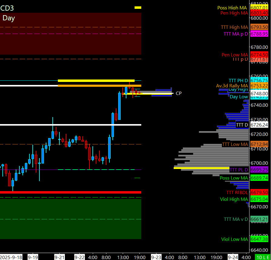 Prior Session was Cycle Day 2This cycle day’s rhythm was dominated by cycle continuation, fulfilling the 6753.22 3 Day Cycle Target on solid persistent buying, following a brief open range consolidation.