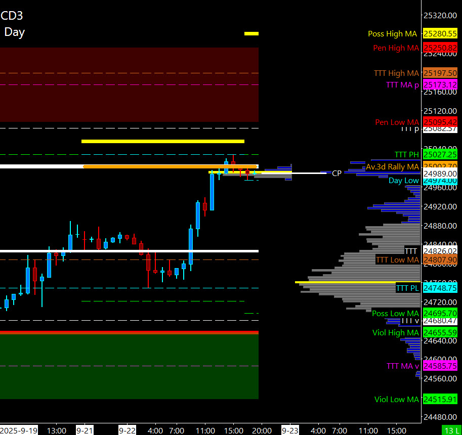 Transition into Cycle Day 3: The current rally is currently above the CD1 Low (24655) and has fulfilled the 25000.70 3-Day Cycle Target.