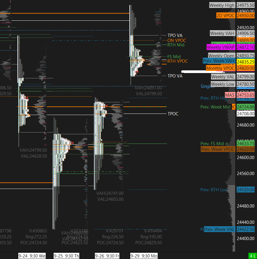 Prior Session was Cycle Day 1: Bullish end of week momentum spilled over into Monday’s CD1 session elevating price to fulfill the range target. As the early bids faded, so did price, settling back throughout the day to fill the gap into Friday’s high, ultimately settling near Mid-VWAP. Cycle Day 1 Low was established @ 24721.75