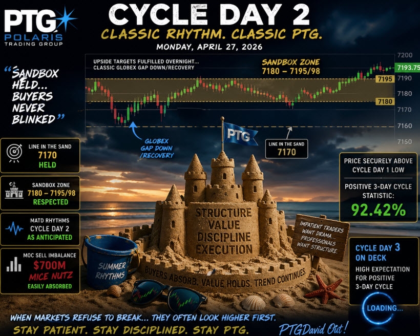 Price remains securely above Cycle Day 1 Low, preserving the Positive 3-Day Cycle statistic (92.42%).